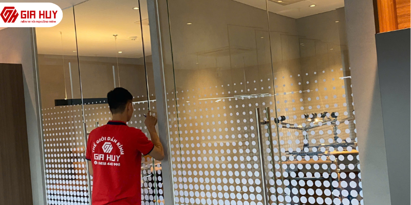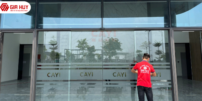 Với sự hỗ trợ của công nghệ CNC, logo hoặc tên công ty sẽ được cắt thủng trên nền decal mờ, tạo thành những mảng trong suốt nổi bật trên kính.