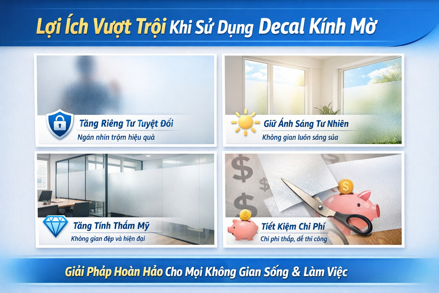 Đừng lo lắng! Decal kính mờ chính là "cứu tinh" mà anh chị đang tìm kiếm. Với những ưu điểm vượt trội, decal kính mờ sẽ giúp anh chị giải quyết tất cả những vấn đề trên một cách dễ dàng và nhanh chóng: