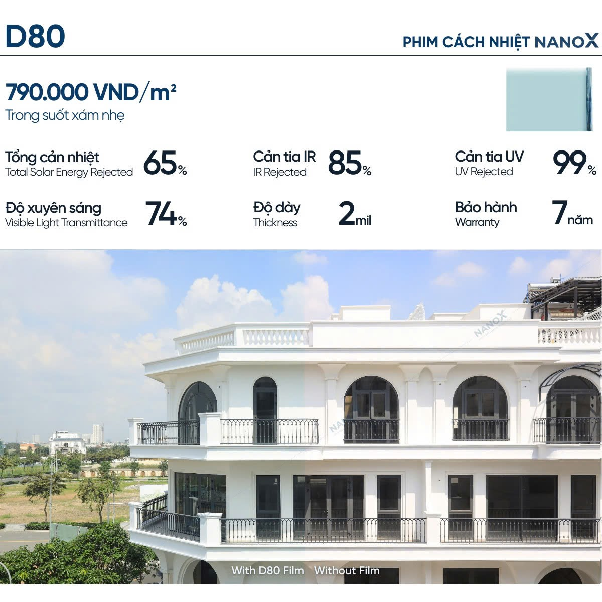 Với khả năng cản nhiệt tổng thể lên đến 65%, NanoX mã D80 giúp kiểm soát nhiệt độ trong nhà một cách tối ưu.