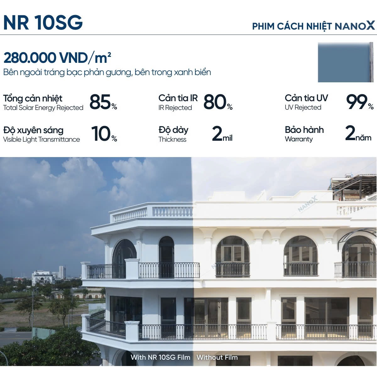Với khả năng cản nhiệt tổng thể lên đến 85%, NanoX mã NR10SG giúp kiểm soát nhiệt độ trong nhà một cách tối ưu.