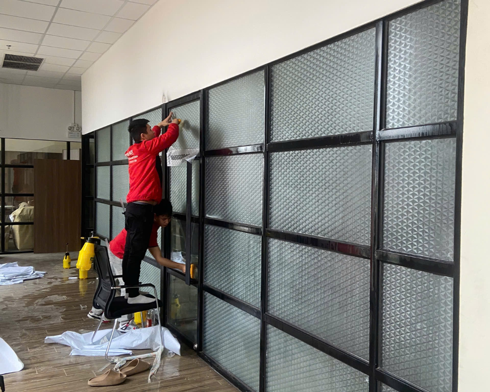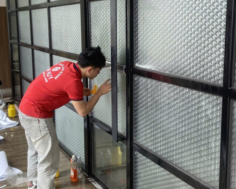 Độ bền của decal dán kính mờ phụ thuộc lớn vào bước này. Kính được vệ sinh kỹ: